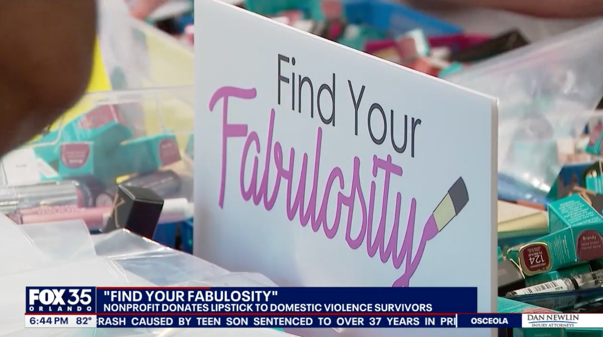 Central Florida TV news channel 13 captured Find Your Fabulosity volunteers counting, bagging, boxing, labeling, and shipping thousands of new lipsticks headed to women’s domestic violence shelters throughout the U.S. It’s an assembly line of women with big hearts helping women with broken hearts. (June 2021